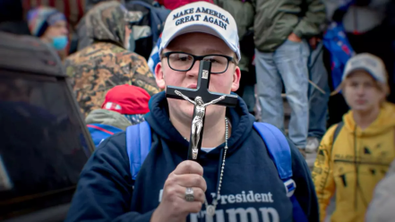 An image from the documentary “Bad Faith: Christian Nationalism’s Unholy War on Democracy” shows an unidentified Trump supporter outside the Capitol. Courtesy of “Bad Faith”.